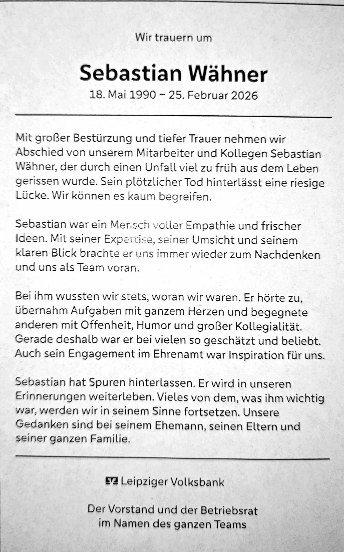 „Sein plötzlicher Tod hinterlässt eine riesige Lücke. Wir können es kaum begreifen. Sebastian war ein Mensch voller Empathie und frischer Ideen. Mit seiner Expertise, seiner Umsicht und seinem klaren Blick brachte er uns immer wieder zum Nachdenken und uns als Team voran. Bei ihm wussten wir stets, woran wir waren. Er hörte zu, übernahm Aufgaben mit ganzem Herzen und begegnete anderen mit Offenheit, Humor und großer Kollegialität. Gerade deshalb war er bei vielen so geschätzt und beliebt. Auch sein Engagement im Ehrenamt war Inspiration für uns. Sebastian hat Spuren hinterlassen. Er wird in unseren Erinnerungen weiterleben. Vieles von dem, was ihm wichtig war, werden wir in seinem Sinne fortsetzen.“